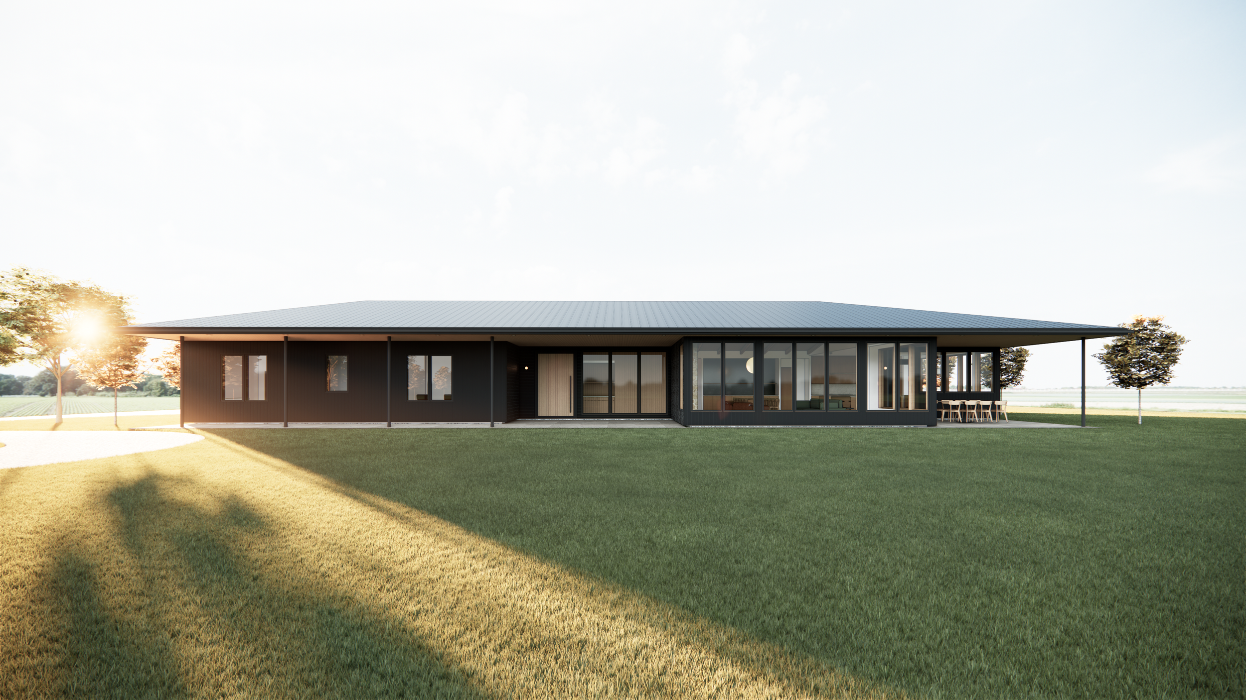 A continuous roofline protects the home's exterior, utilizing deep eaves to provide passive solar shading on the south and east facades. Coupled with a material palette of warm wood, textured stone, and charred cedar, the residence is a quiet, highly tailored environment designed to age gracefully within the landscape.